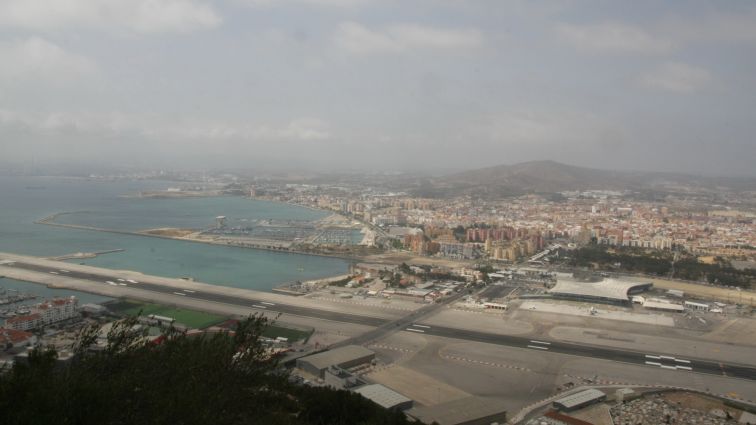 Widok na pas startowy. Przez pas prowadzi droga na Gibraltar.
