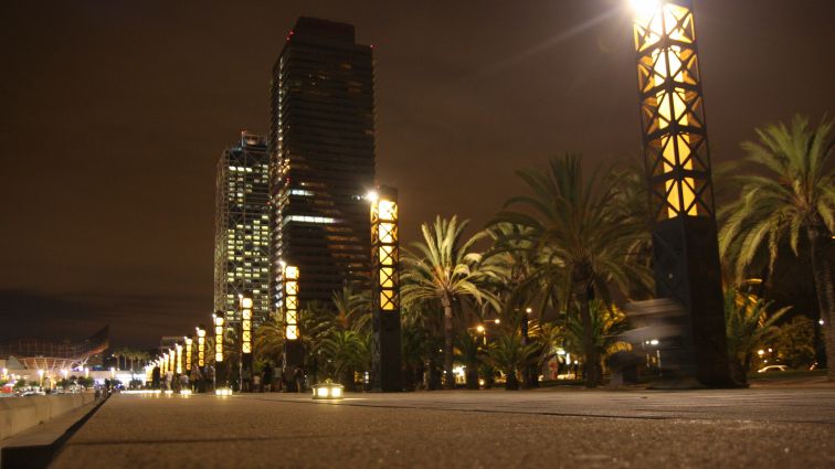 Barcelona nocą. Hotele przy plaży miejskiej.