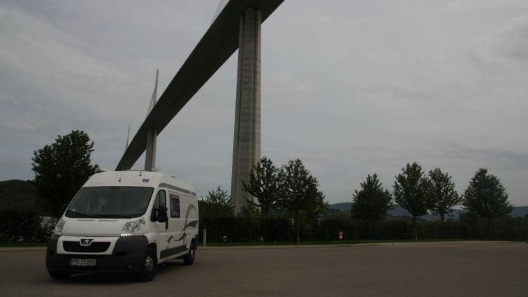Parking pod wiaduktem Millau. Obok znajduje się jedna z dwóch wystaw o jego budowie.